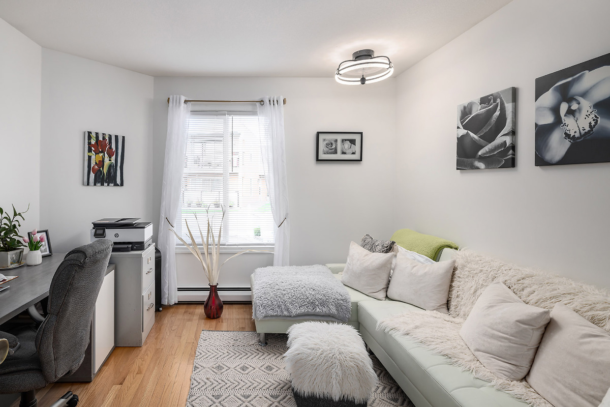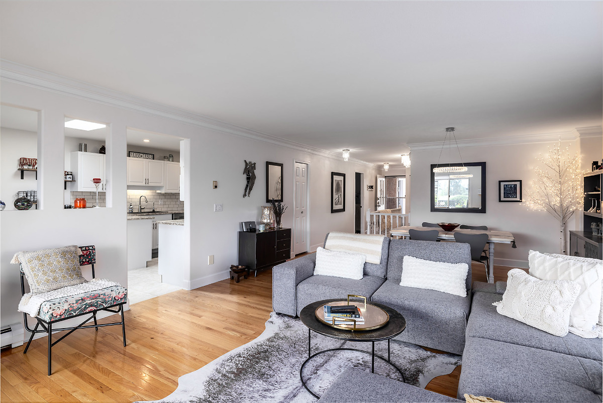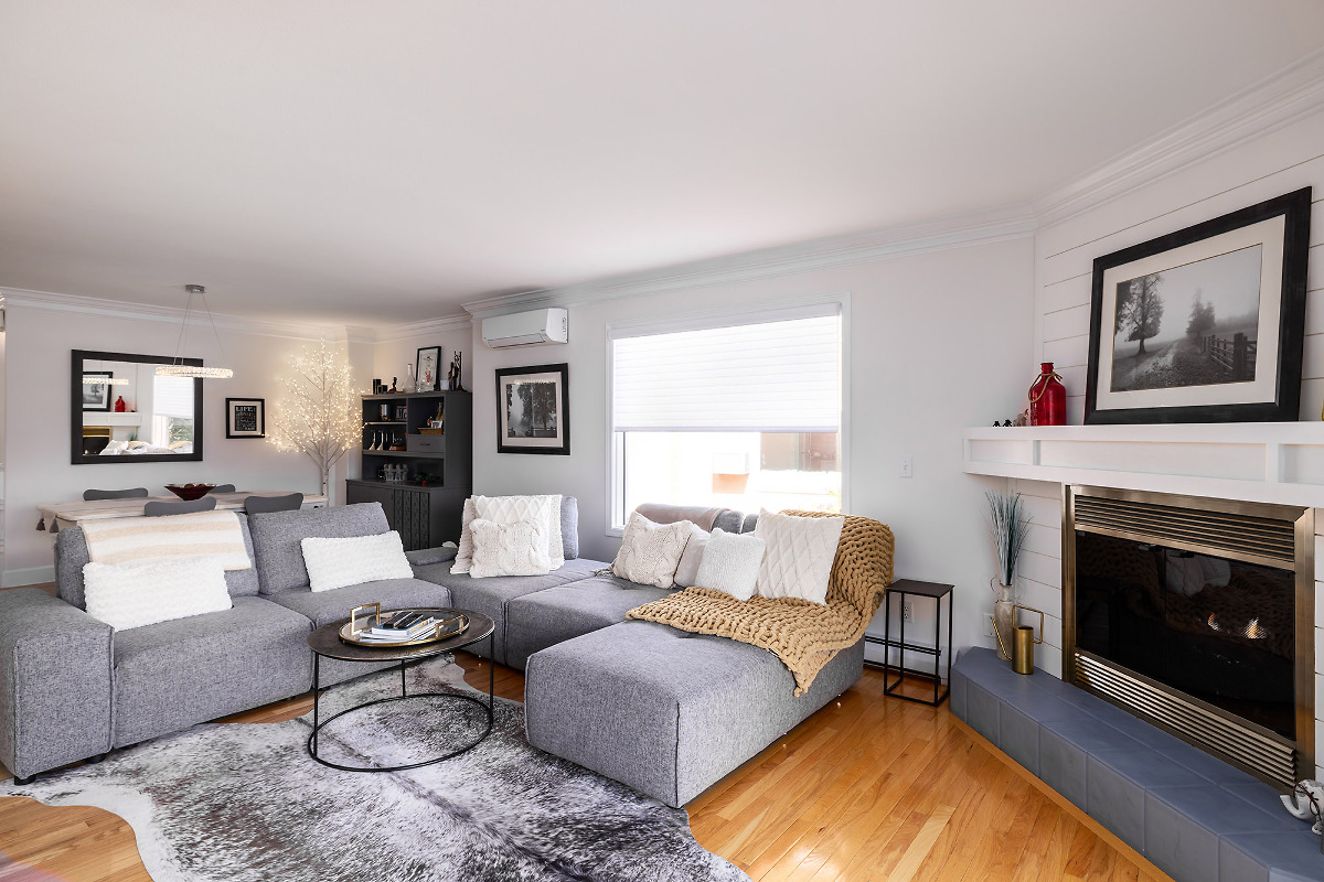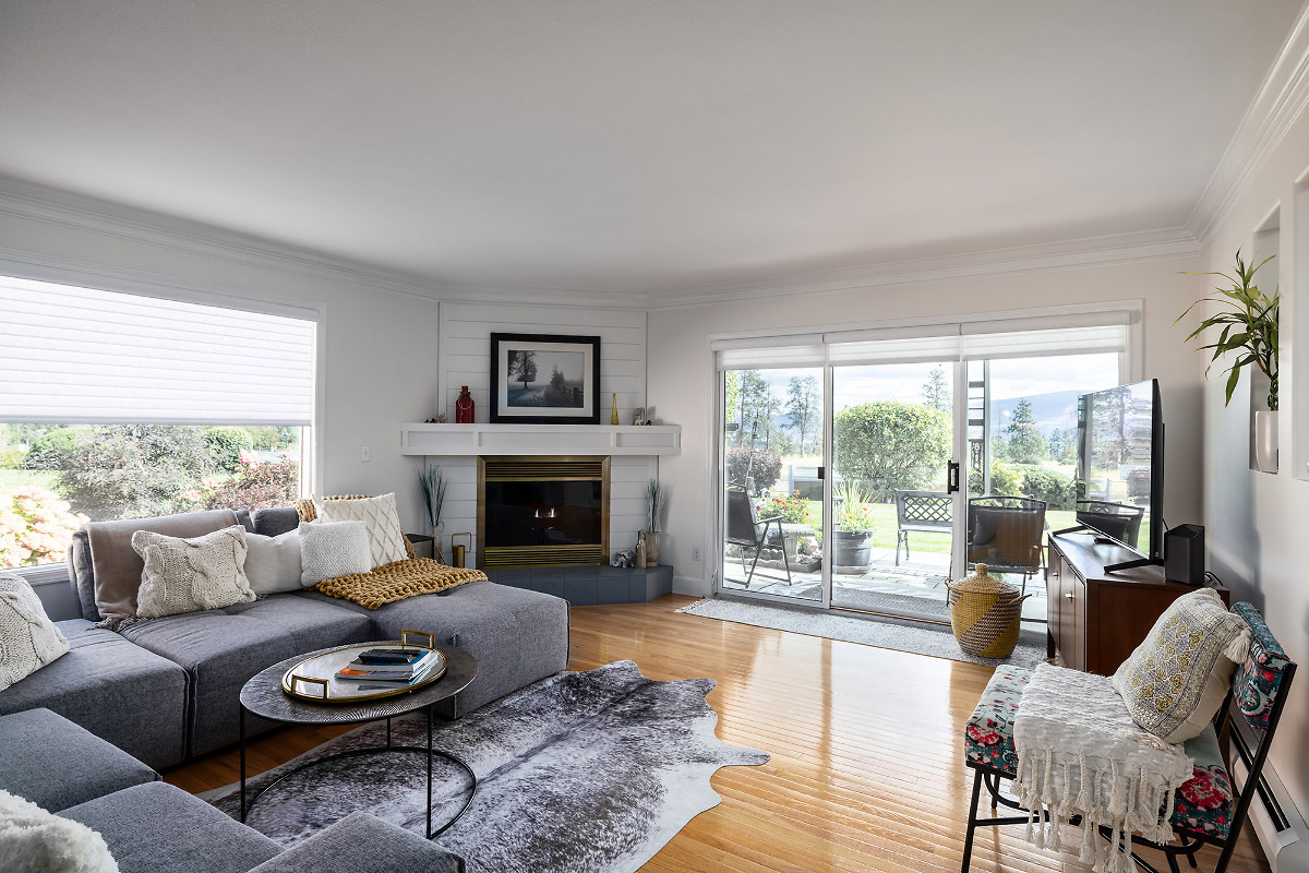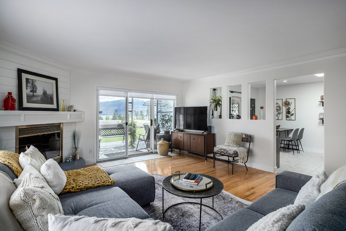 Immaculate FREEHOLD semi-detached duplex with Mountain/Lake Views & leisure gardens. 55+. Fully renovated with 2 primary suites, crown moldings, hardwood & vinyl flooring, 3 skylights, 2 gas f/p, A/C, patio, garage & proximity to amenities; incl beach & rec center. Strata incl heat, h/w & gas f/p maintenance. Elec $56/month. Don't miss this gem.