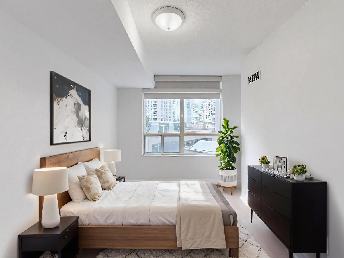 Check out this stunning 1 Bedroom + Den condo at Ovation Tower in Mississauga! Bright, functional layout featuring new laminate floors, fresh paint, and an updated kitchen with a movable island. Open living/dining with balcony. A spacious bedroom with a walk-in closet and a versatile den. Includes in-suite laundry & 4pc bath. All utilities are included, plus resort-style amenities. Steps to Square One, transit & more!