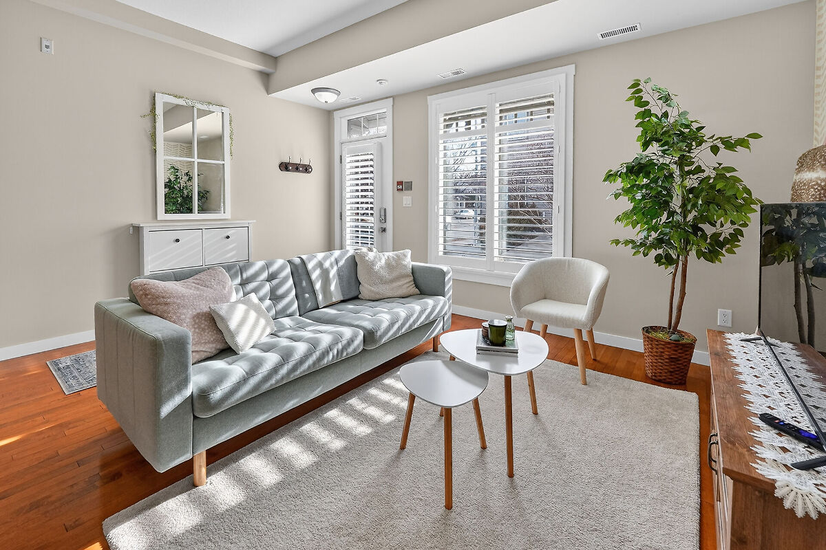 This bright two-story loft-style townhome Unit 11 faces the courtyard in a sixteen-home complex. Move-in ready with hardwood floors, nine-foot ceilings California shutters modern kitchen with stainless steel appliances breakfast bar and storage Upstairs offers a spacious bedroom with ensuite laundry Rare two car parking. Walk to town: